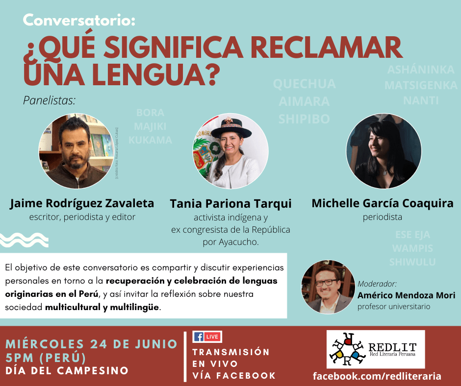 Nuevamente se ha dado la oportunidad de proponer otro espacio de discusión ese miércoles 24 de junio, esta vez junto a Tania Pariona, ex congresista de la República y warmi líder de Ayacucho, el escritor Jaime Rodríguez Zavaleta y la periodista Michelle García Coaquira (con quien estamos co-organizando), porque el tema siempre ofrece nuevas aristas y perspectivas. Adicionalmente, esto sucede en un momento en que pensamos anunciar una iniciativa comunitaria para la reclamación y la celebración de nuestras lenguas originarias en Perú (ya contaremos pronto más detalles). Por lo pronto, les invitamos este miércoles a las 5pm (Hora de Perú). Nos vemos el miércoles. –Américo
