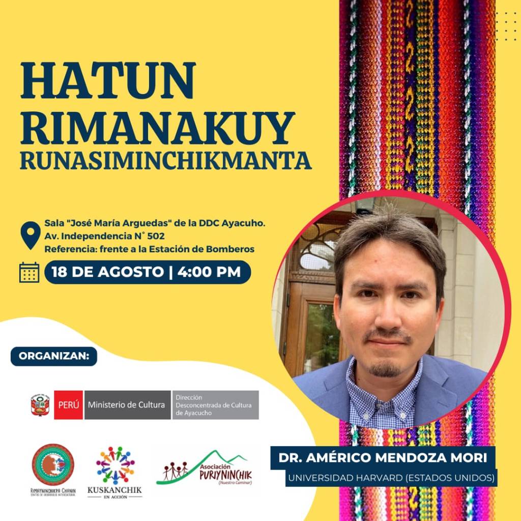 En agosto, mes de los pueblos indígenas, llevaremos acabo el Hatun Rimanakuy Runasiminchikmanta “Iniciativas de revitalización del quechua a nivel local e internacional, y los desafíos al futuro”, con la participación del Dr. Américo Mendoza Mori, catedrático de la Universidad de Harvard en Estados Unidos dedicado a la promición de la lengua quechua en la academía. Este evento es co-organizado por la Dirección Desconcentrada de Cultura, la Asociación Rimayninchikpa Chanin – RIMAYCHA, Asociación Puriyninchik y la Asociación “Kusqanchik”, evento que convocará a múltiples actores de la región a un conversatorio abierto, horizontal y de mutuo aprendizaje.